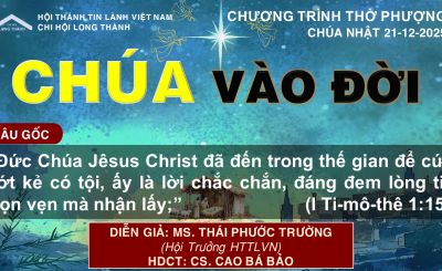 CHÚA VÀO ĐỜI – MS. THÁI PHƯỚC TRƯỜNG – HỘI TRƯỞNG HTTLVN || 21-12-2025 21 Tháng mười hai, 202521 Tháng mười hai, 2025Bài giảng CHƯƠNG TRÌNH THỜ PHƯỢNG CHÚA NHẬT || 21-12-2025 Chủ đề: CHÚA VÀO ĐỜI – MS.… Xem tiếp